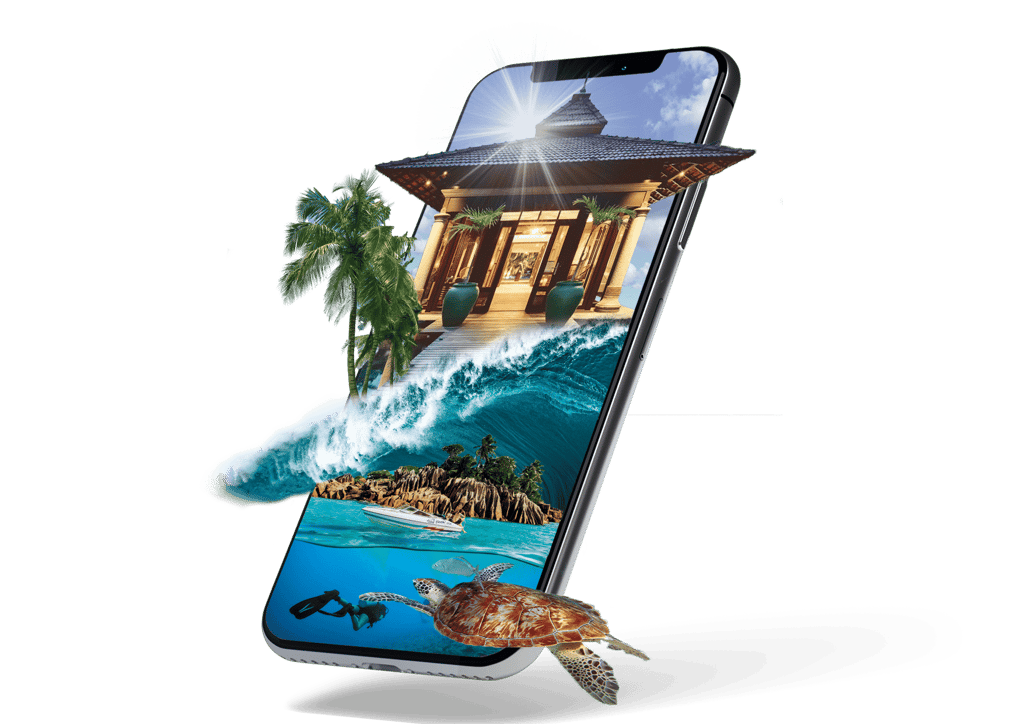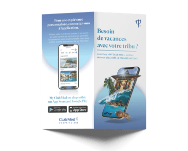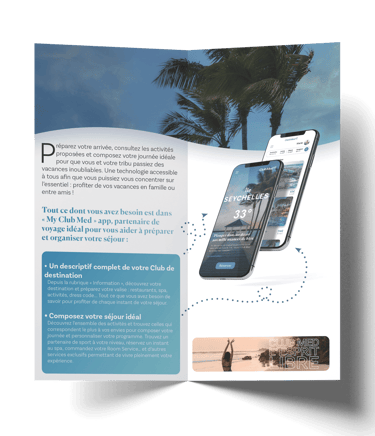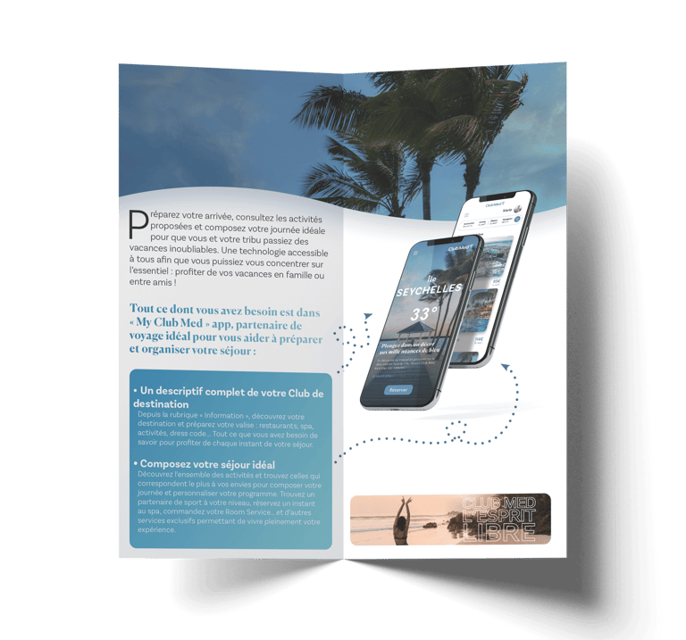 la nouvelle application My Club Med dans un dépliant publicitaire tout en réalisant un montage Photoshop avec un visuel sur le thème des vacances sortant d'un téléphone.